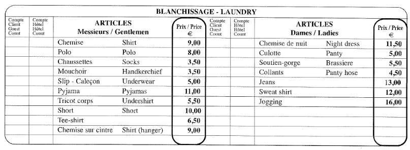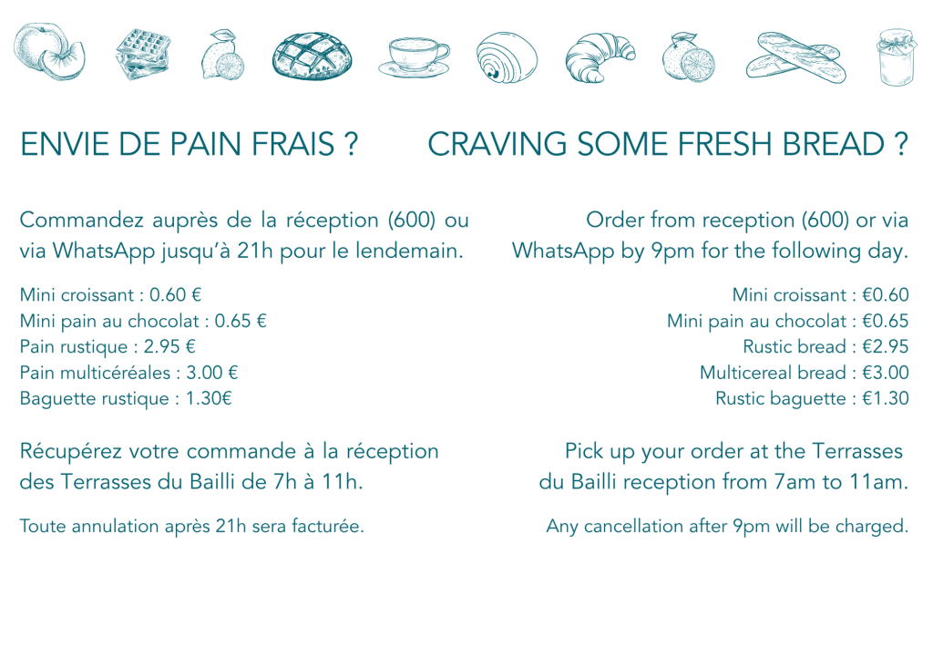 For all laundry requests, please contact the Terrasses du Bailli reception. Linen handed in before 11am will be available from 7.30pm the same day.
